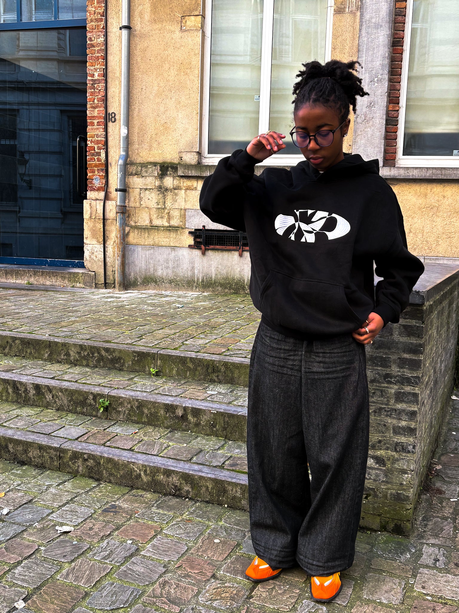 LOOSE ONYX BLACK HOODIE WITH EMBROIDERY ON COTTON FLEECE